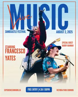 Enjoy live entertainment all day long at the Cobourg Sandcastle Festival! Dance to the beats of our Beach DJ from 10 AM to 5 PM, then head to the Bandshell for an unforgettable performance by Canadian pop sensation Francesco Yates. It’s a full day of music, energy, and summer vibes!