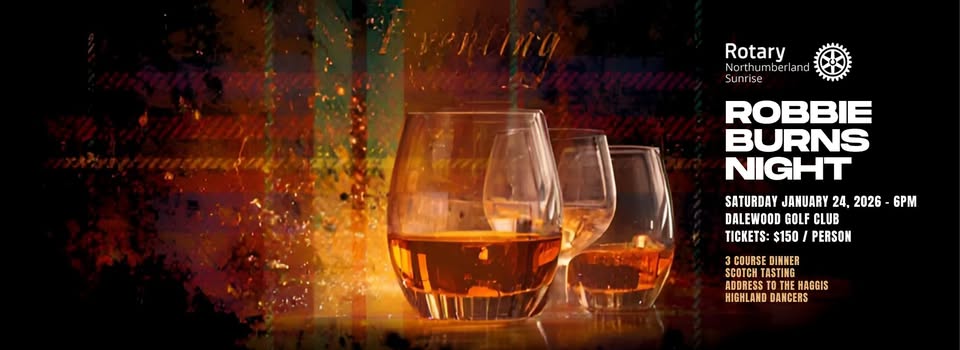 Enjoy an unforgettable evening of food, drink, and entertainment at the Annual Rotary Club of Northumberland Sunrise Robbie Burns Night and Scotch Tasting, held at Dalewood Golf Club on January 24 at 6 p.m. Celebrate Scottish tradition while sampling fine scotch and savoring a delicious meal in great company. This festive night is proudly hosted by the Rotary Club of Northumberland Sunrise.