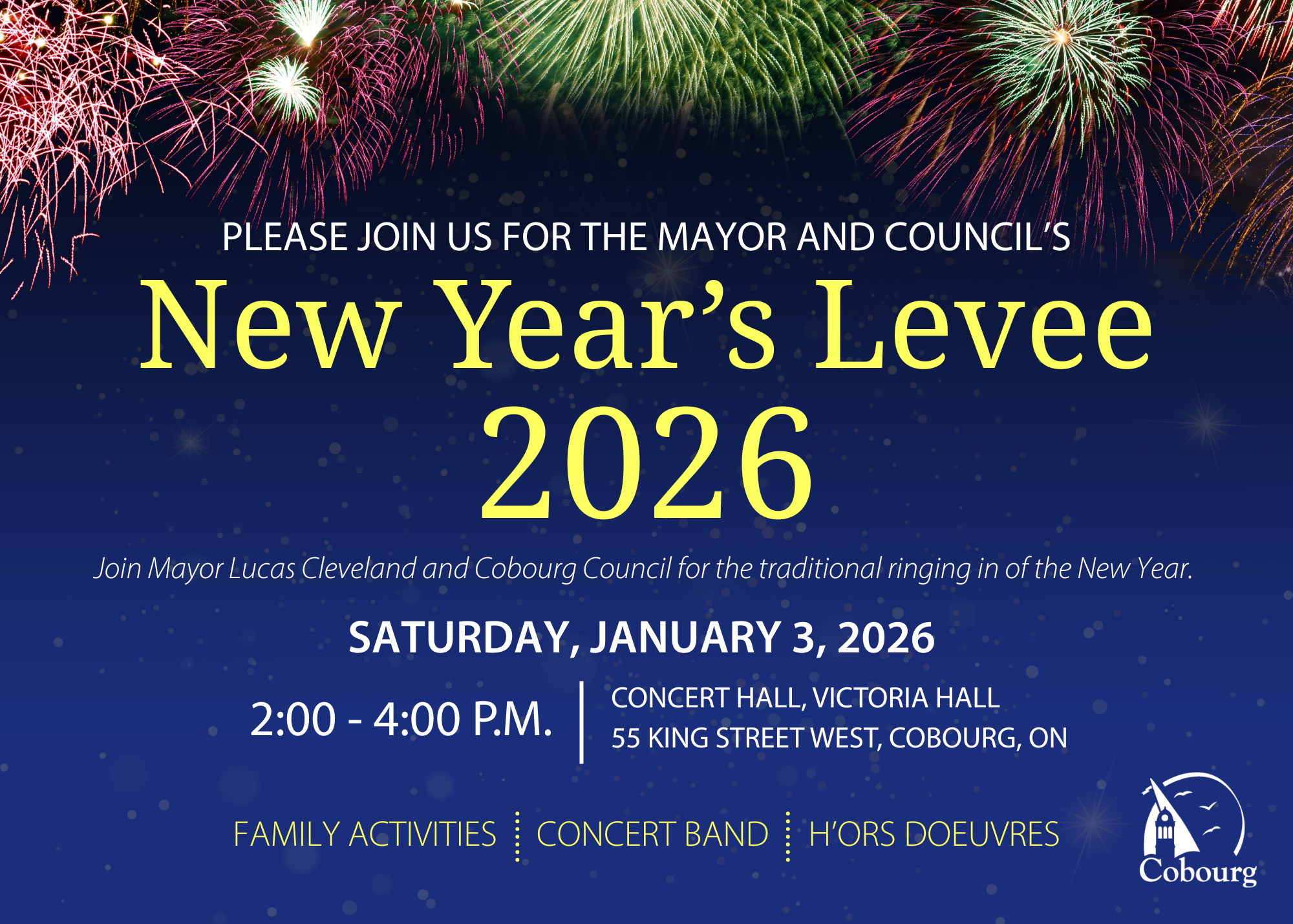 First Night Cobourg returns on Wednesday, December 31, offering a free, family-friendly New Year’s Eve celebration with outdoor skating, music, horse-drawn wagon rides, and festive lights throughout Victoria Park and the waterfront. The evening ends with a fireworks countdown, bringing the community together to welcome 2026 in a joyful winter setting.