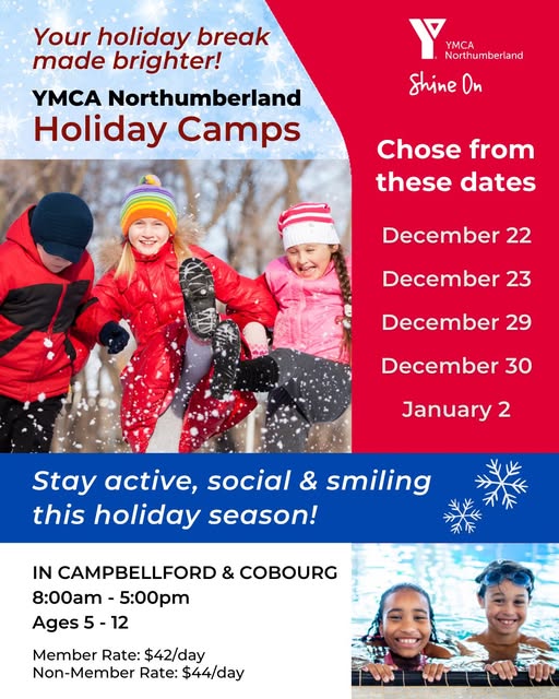 Keep kids active, social, and smiling this holiday season a Holiday Day Camp at the Cobourg Y. Running January 2, 2026, for ages 5–12, with regular hours from 8 AM–5 PM and optional extended care. Each day includes outdoor play, swim time, gym activities, and time in the play centre. Cost is $44 per day ($42 for members). Spaces are limited, so be sure to book early.